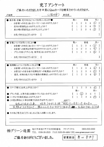 旭川市 M様邸 お客様の声 公開日:2018年02月22日 ■エリア 北海道 旭川市 M様邸 ■施工内容 エクステリア工事 (造園・カラー砂利・防草シート・土留etc)■時期 2017年7月 ご相談は無料!お気軽にお問い合わせください 0120-255-625 受付 9:00 - 17:00 お問い合わせフォーム 前の記事へ 次の記事へ